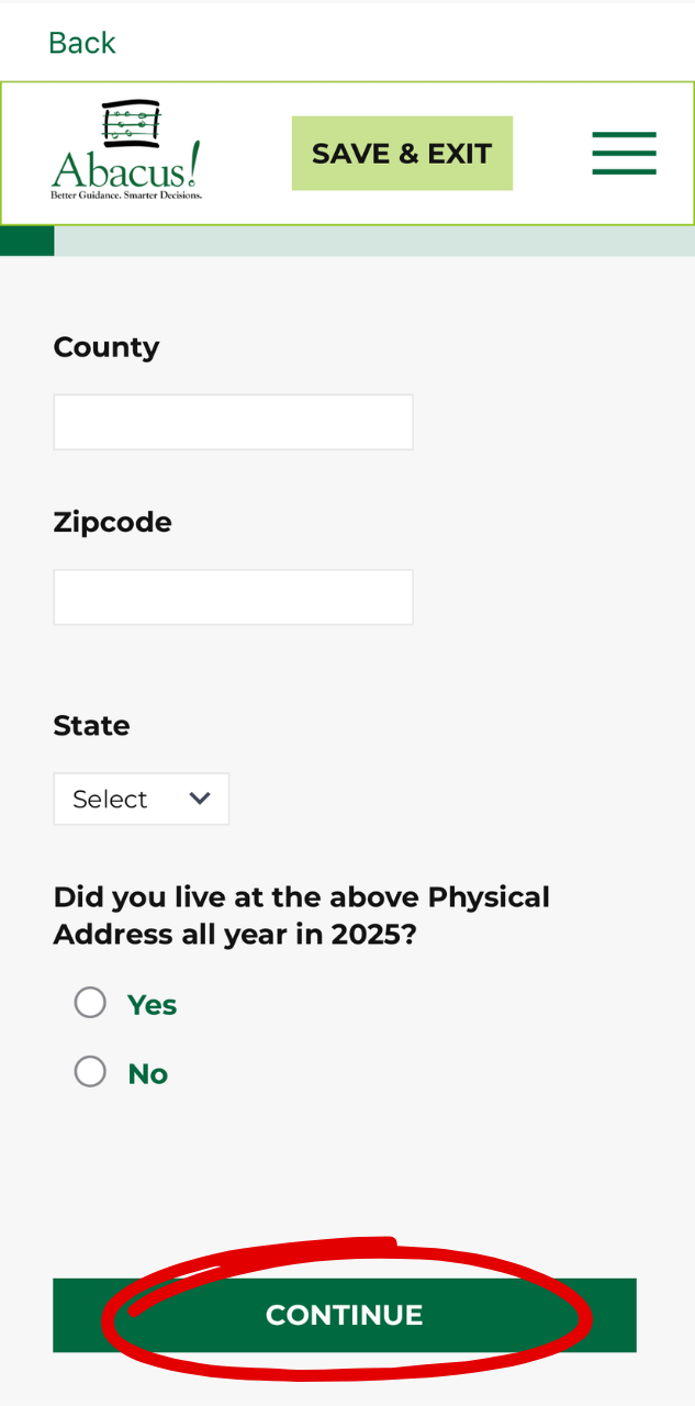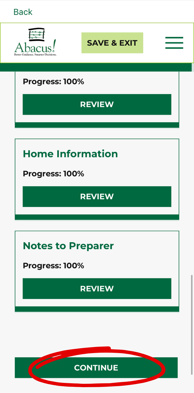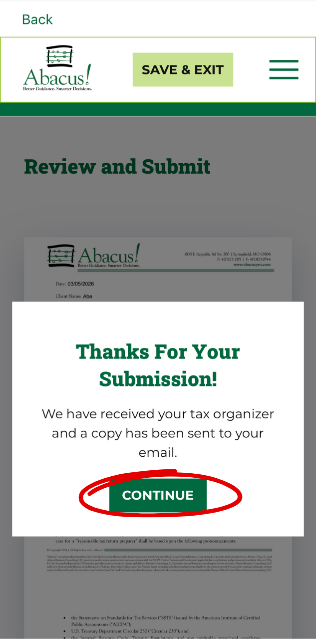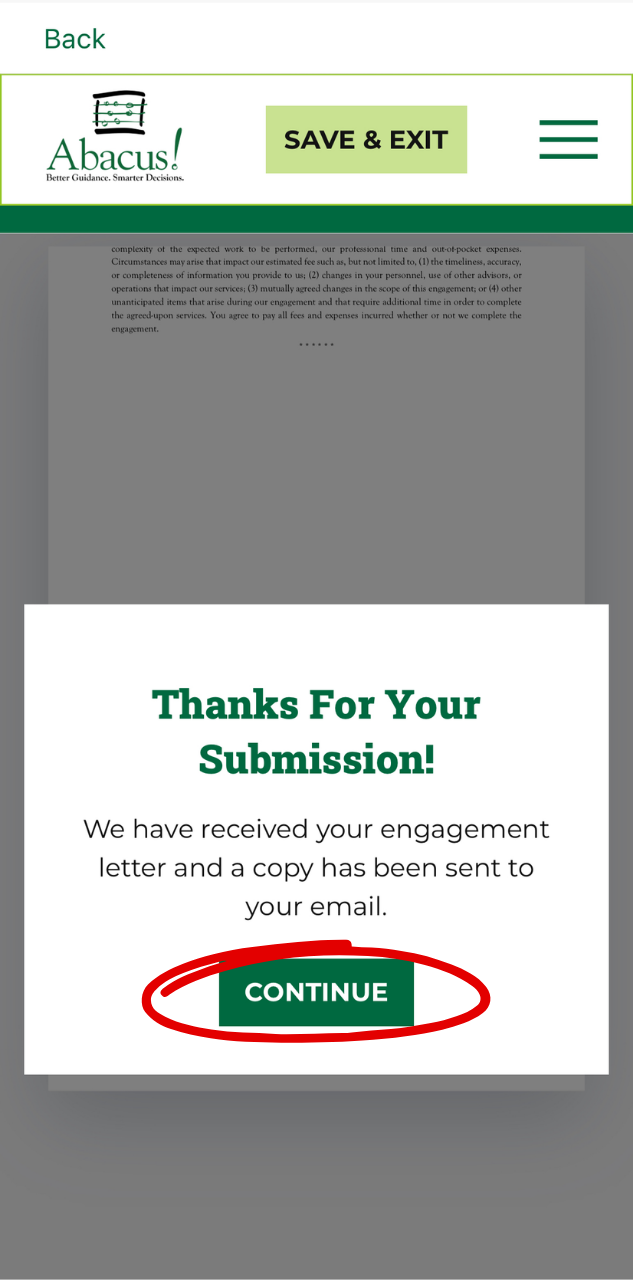 - You and Abacus! will both receive emails confirming your submission through the app. After checking this, click “Continue.”