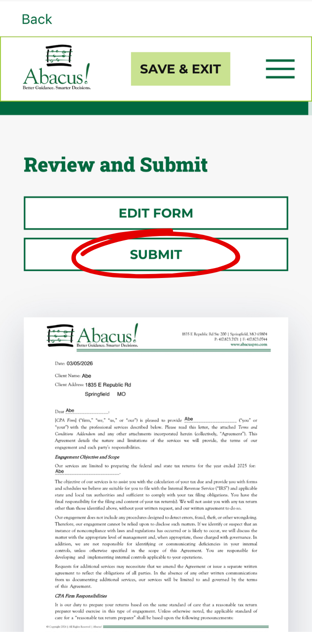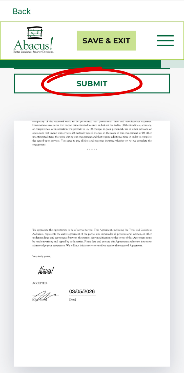 - Review the Engagement Letter if needed, or scroll to the bottom to confirm your signature is correct. After that, click “Submit.”