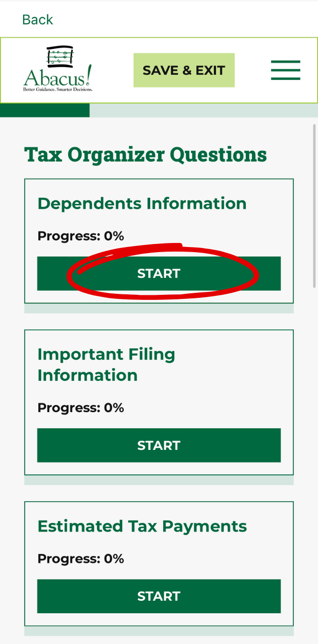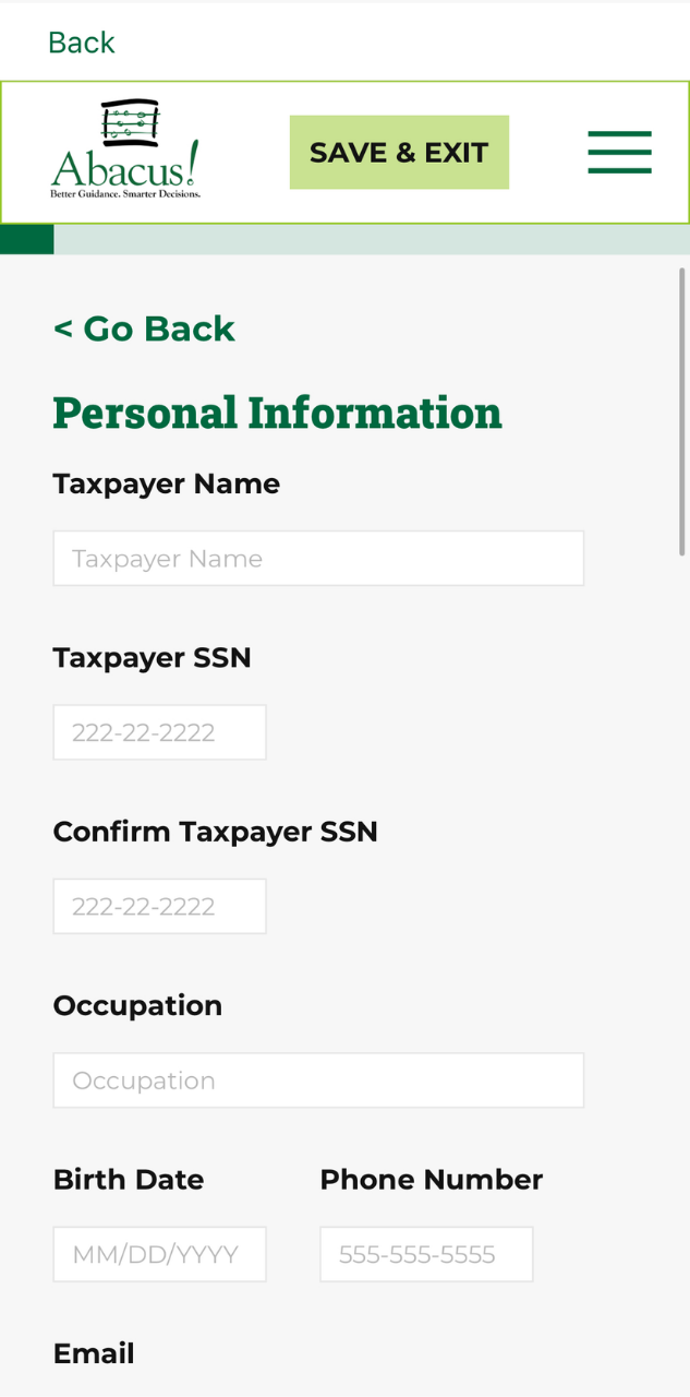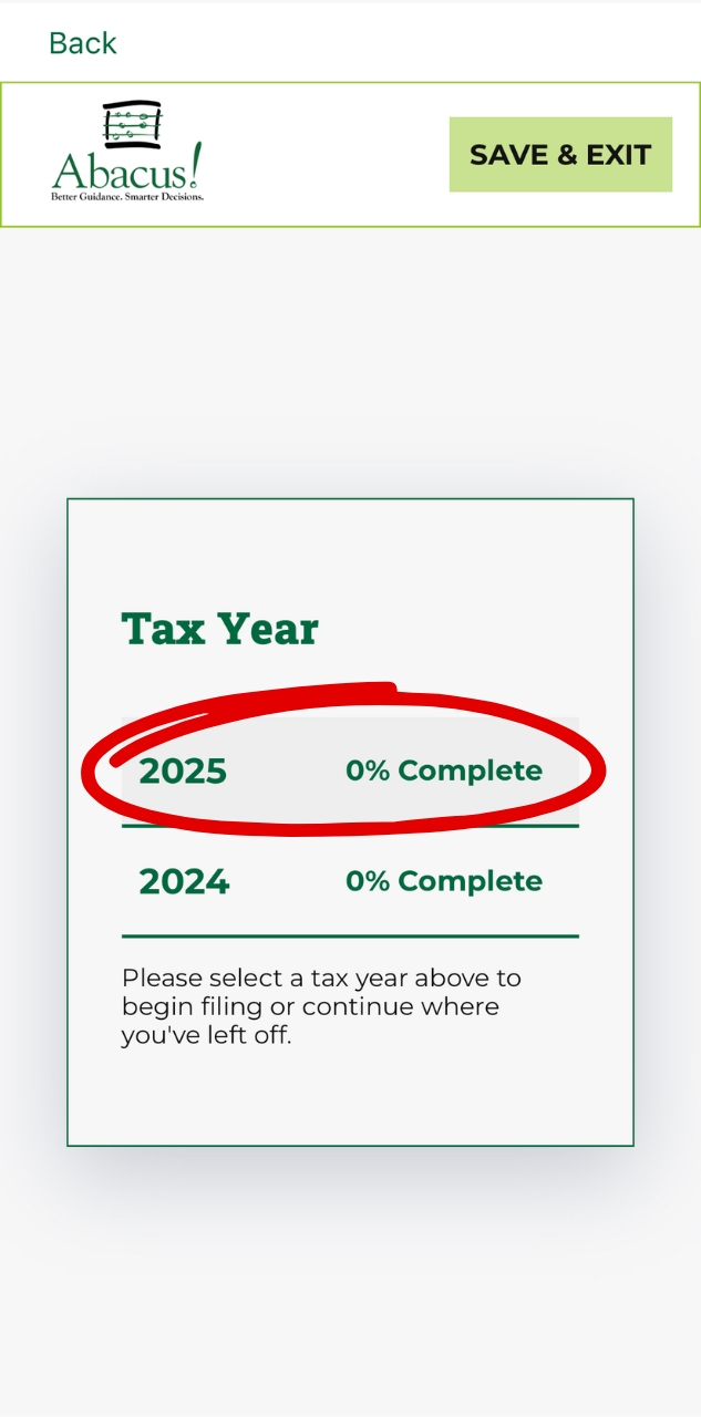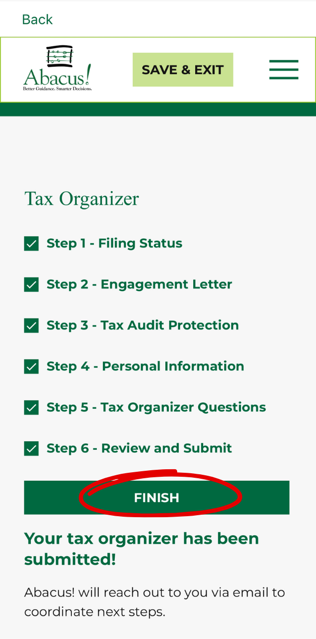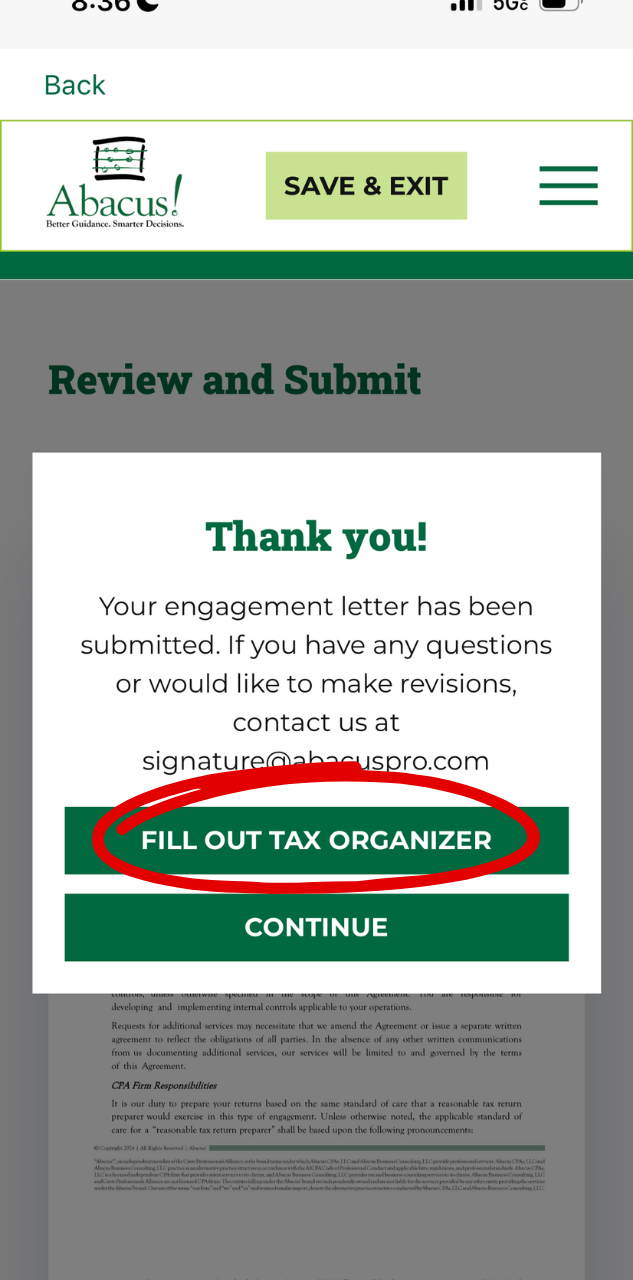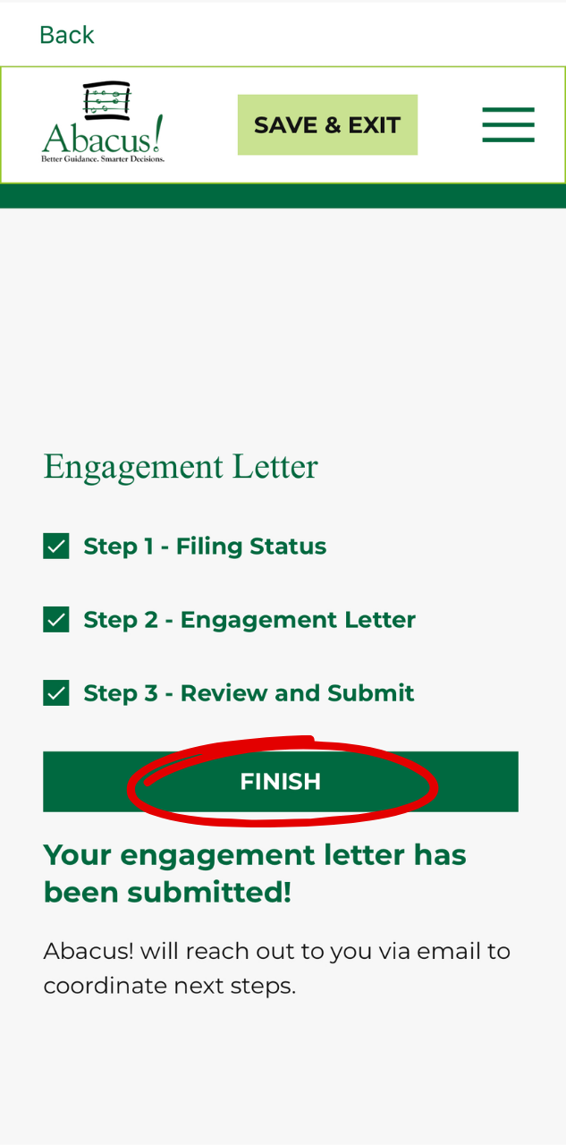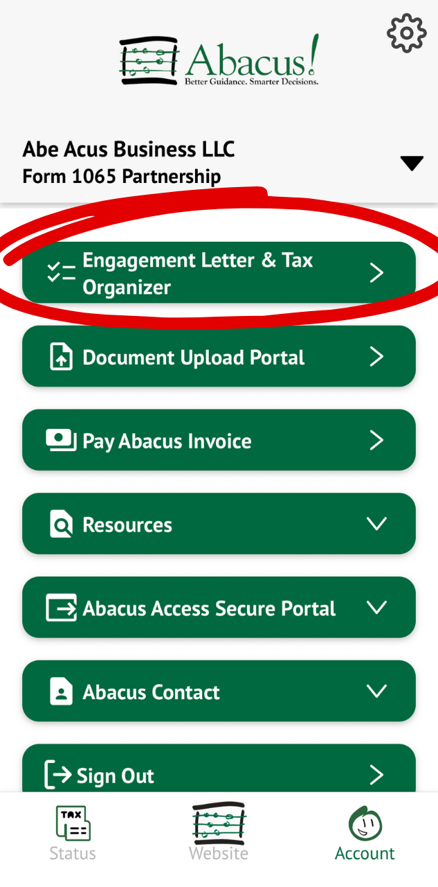 Follow this step-by-step guide to fill out your Engagement Letter and Tax Organizer using the Abacus! App (mobile version). View our web version step-by-step guide here to learn how to use the app on your web browser.