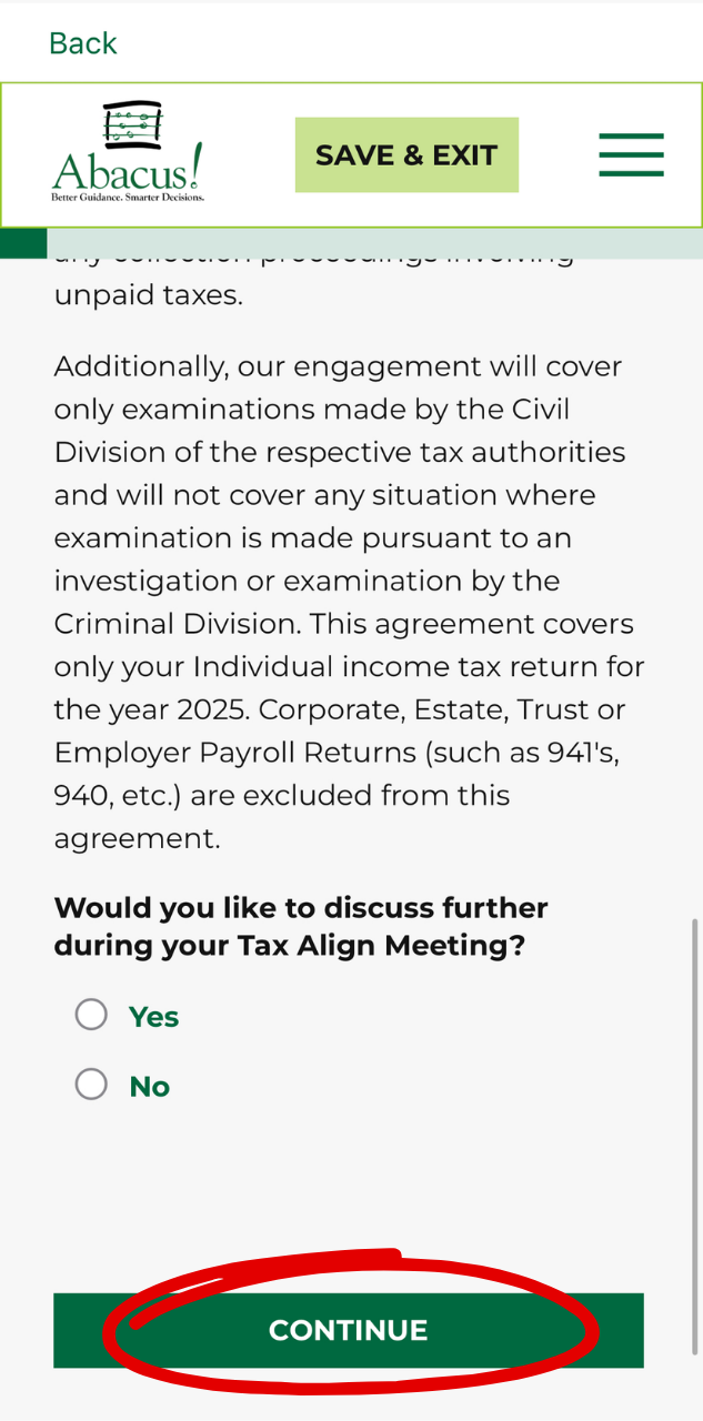 - Review the Tax Audit Protection offering and determine whether you want to discuss it during your ALIGN meeting with your Abacus! Professional. Once you’ve made your choice, click “Yes” or “No” and then select “Continue.”