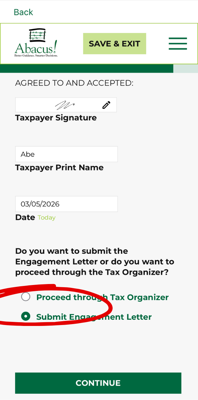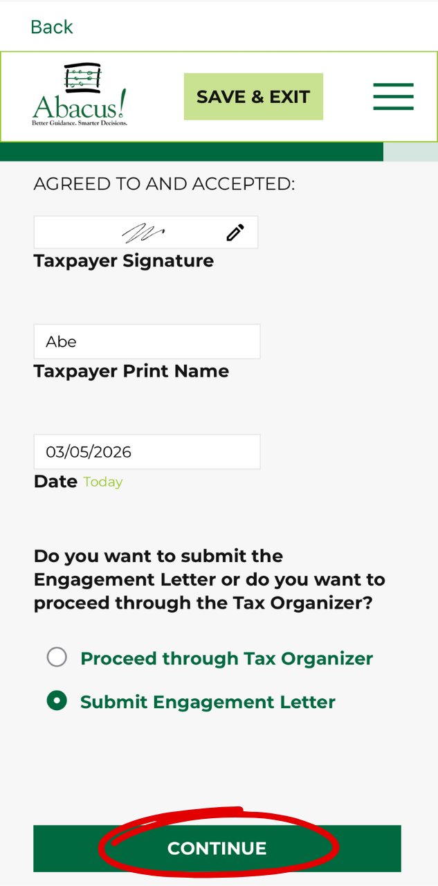 - Select “Submit Engagement Letter” or “Proceed to Tax Organizer.”